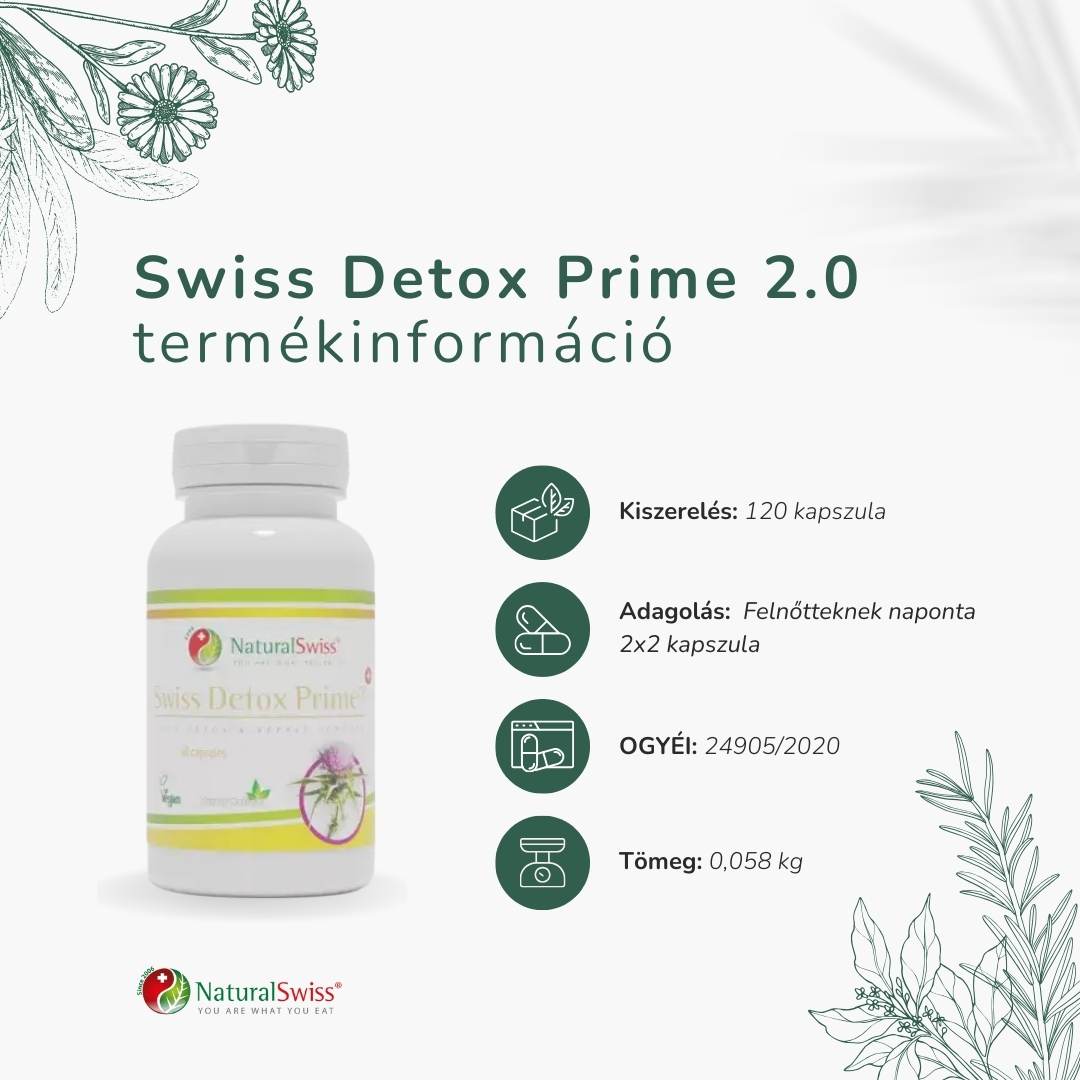 A kizárólag természetes hatóanyag-tartalmú Swiss Detox Prime 2.0 egy növényi májvédő készítmény. Összetevői méregtelenítő és májsejt regeneráló hatással bírnak. A készítményben található máriatövis kivonat védelmet nyújt a szabadgyökök káros hatásai ellen, a kolin részt vesz egyes sejtmegújító folyamatokban, a C-vitamin pedig erősíti az immunrendszert.