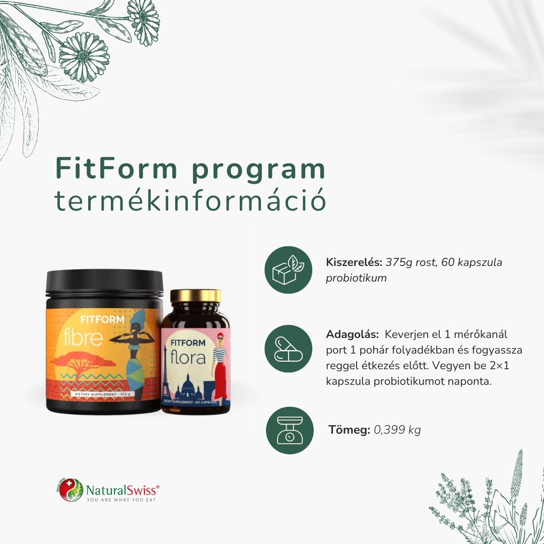 A tartós fogyás kulcsa elsősorban a megfelelő táplálkozás és a rendszeres testmozgásban rejlik, ezek hiányában sosem fogjuk elérni a kívánt testsúlyt. Viszont bizonyos kiegészítőkkel támogathatjuk a fogyást, főleg ha a lassú anyagcsere miatt nem indul be. Erre szolgál a FitForm program, amely 2 egyedi összetevős terméket foglal magába: az anyagcsere-fokozó és magas rosttartalmú FitForm Fibre és a fogyást elősegítő, probiotikus baktériumtörzseket tartalmazó FitForm Flora.