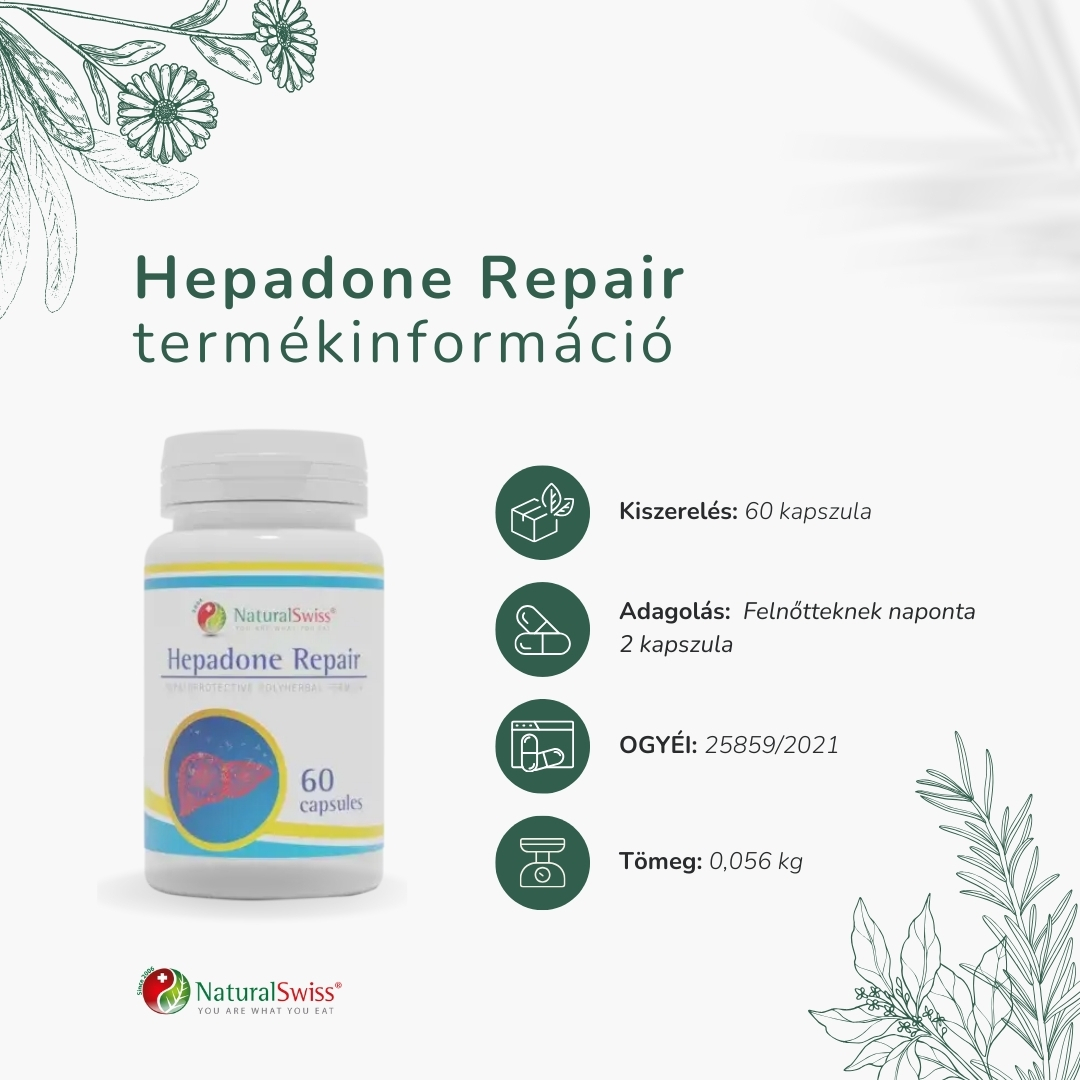 A természetes hatóanyag-tartalmú Hepadone Repair egy gondosan megalkotott, a máj védelmét szolgáló növényi készítmény. Gyógynövény összetevői a májműködésre gyakorolt pozitív hatásukról, méregtelenítő és májsejt védő tulajdonságukról ismertek. A termék vegetáriánusok számára is fogyasztható, valamint nem tartalmaz tartósítószert és színezéket.