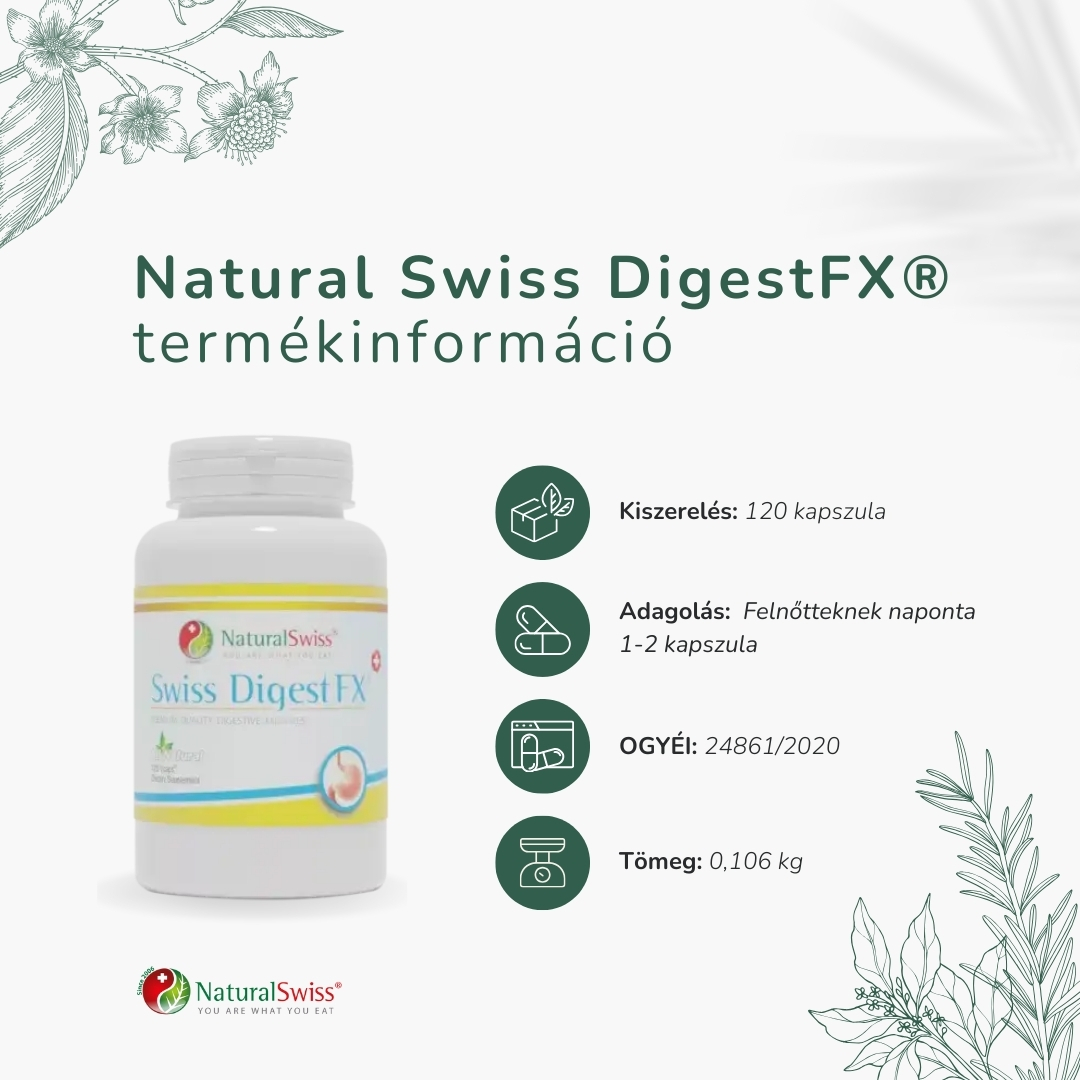 A Swiss DigestFX természetes enzimeket tartalmaz, amelyek segítik az emésztést és a tápanyagok hatékonyabb felszívódását.