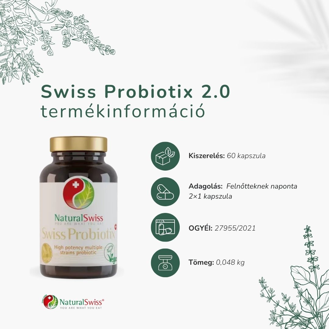 A Swiss Probiotix 2.0 jótékony baktériumai elpusztulnának a gyomor savas környezetében, ha nem védené meg őket a kapszulák bevonata, amely kizárólag a bélben oldódik fel. A készítmény életképes baktériumtörzseket tartalmaz, melyek por formában kerülnek a kapszulákba és ellenállnak a gyomorsavnak. A csomagolás nedvességálló, megóvja a baktériumokat a külső hatások okozta károsodástól. A termék használatát ajánljuk mindazoknak, akik emésztési problémákkal küzdenek, a bélflóra egyensúlyára vagy az immunrendszer megfelelő működésére törekszenek. A probiotikus termékek használata tejcukor (laktóz) érzékenységben küzdőknek, aktív életvitelt, magas fehérjetartalmú étrendet követő, sportoló személyeknek és cukorbetegeknek egyaránt szolgálhatnak pozitív egészségügyi hatásokkal.
